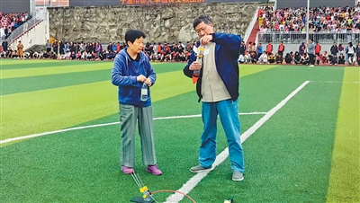忻元华(右)和滕崇在操场进行科普实验展示。