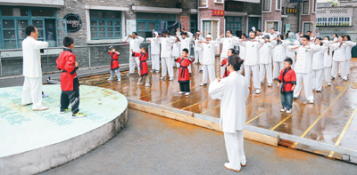 在八段锦推广老师和“小小中医师”们的带领下,留学生在练习中国传统养生功法八段锦。崔 力摄 |