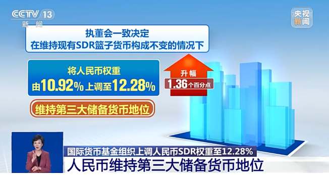 近日,国际货币基金组织执董会完成了五年一次的特别提款权(SDR)定值审查,执董会一致决定,将人民币权重由10.92%上调至12.28%,升幅1.36个百分点。