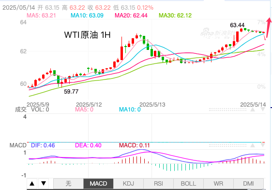 由于中美达成90天协议,将关税大幅降低115%,提振了油价需求前景,油价攀升至63.00美元附近。
