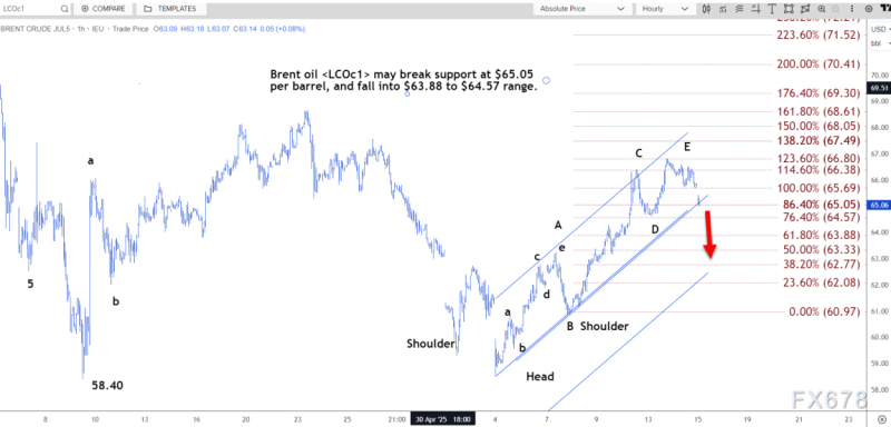 周四(5月15日)亚洲时段,国际油价大幅走弱,布伦特原油目前交投于64.83美元/桶附近,跌幅约1.37%。路透技术分析师指出,布伦特原油可能跌破每桶 65.05 美元的支撑位,跌至63.88 美元至 64.57 美元的区间。    五浪结构以及过去两天的下跌趋势已确认,自 58.40 美元以来形成的上涨趋势已出现逆转。此前,该趋势一直在上升通道内发展。