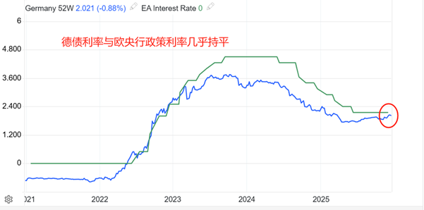 欧央行三大关键政策利率分别为再融资利率、边际贷款利率和存款机制利率,当前利率水平分别为2.15%、2.4%、2%。德国一年期国债收益率为2.03%,基本与存款机制利率持平,意味着债券市场相对存在市场并未存在溢价,这也是欧央行将维持利率不变的特征之一。