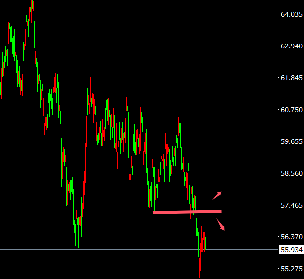 原油周四继续震荡下行,当天最高57,最低55.8,日线收阴于56,日线看油价将继续震荡下行,四小时线,小时线,油价呈震荡,短线待区间突破,综述日内操作思路以震荡下行为主,上方关注57,下方看55能否下破