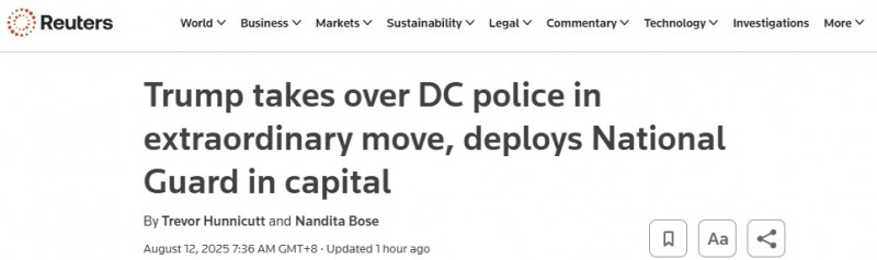 当地时间周一(8月11日),美国总统特朗普(Donald Trump)宣布华盛顿特区进入公共安全紧急状态。特朗普称,将把华盛顿特区警察局置于联邦的直接管辖之下,他将向华盛顿特区部署800名国民警卫队士兵,帮助重建华盛顿特区的法律、秩序和公共安全。