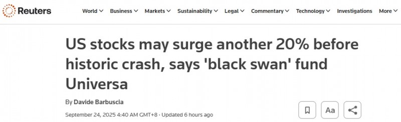 FX168财经报社(亚太)讯 英国路透社周三(9月24日)报道称,知名黑天鹅基金Universa创始人Mark Spitznagel指出,市场狂热可能推动美国股市再上涨20%,但最终将迎来规模可比1929年金融危机的崩盘,并引发全球经济衰退。