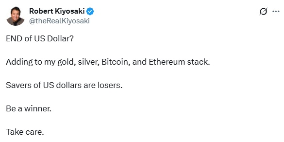 清崎于10月8日在社交媒体平台X上写道:“美元的终结?增加我的黄金、白银、比特币和以太坊储备。持有美元的储蓄者是失败者。成为赢家。保重。”