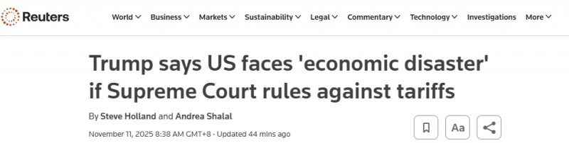 FX168财经报社(亚太)讯 英国路透社周二(11月11日)最新报道称,美国总统特朗普(Donald Trump)周一表示,如果最高法院裁定他动用紧急权力法对几乎所有国家征收全面关税的动议无效,美国将面临经济和国家安全灾难。