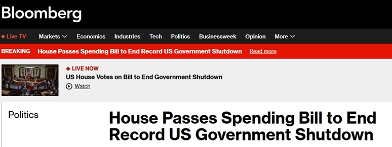 FX168财经报社(亚太)讯 美国彭博社当地时间周三(11月12日)晚间最新报道称,为期六周、在美国总统特朗普(Donald Trump)与国会民主党人之间展开的冲突——期间全国航班受到干扰、数百万人的食品援助被延迟——即将在数小时内结束,因为众议院已通过一项临时拨款法案。