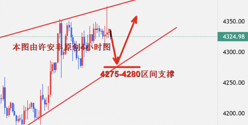 少年辛苦终身事,莫向光阴惰寸功,坎坷的道路方能成就前方平坦大道,昨日美盘多头冷不丁的发力,最高触及到4375附近位置,让市场有些猝不及防,而又快速回落,并且于早间最低触及到4309附近位置,在经过漫长的区间震荡之后,仿佛趋势有些明朗,对于昨日的冲高回落而言,再次逼近了历史新高4381附近位置,也很有可能短线内形成了顶部位置,在突破的同时,回撤的幅度也将是我们后期需要考虑的因素之一,我们也多次提出,行情反转需要满足的条件是回撤的幅度,一旦快速回落的话,那么继续上行的动力也将会衰竭,而目前对于形势而言,昨日日线也是属于高位阴线的十字星形态,我们白天保持震荡思路对待,虽然没有成功站稳4350一线上方,但是总体的行情思路趋势继续保持回踩做多不动摇进行,下方着重关注4266—4275区间得失即可。