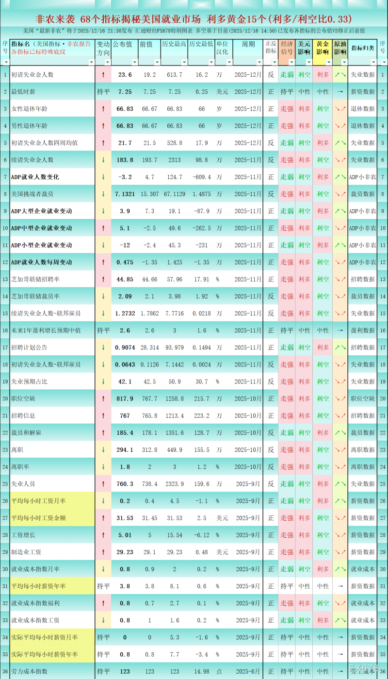 由于图片太长,分成两张图上下放置。第一张图 1-36个指标,第二张图,第37-68个指标。 本图多空基于目前(截止2025/12/16 14:50)只能看到的上期美国非农的公布值VS前值的比较结果。