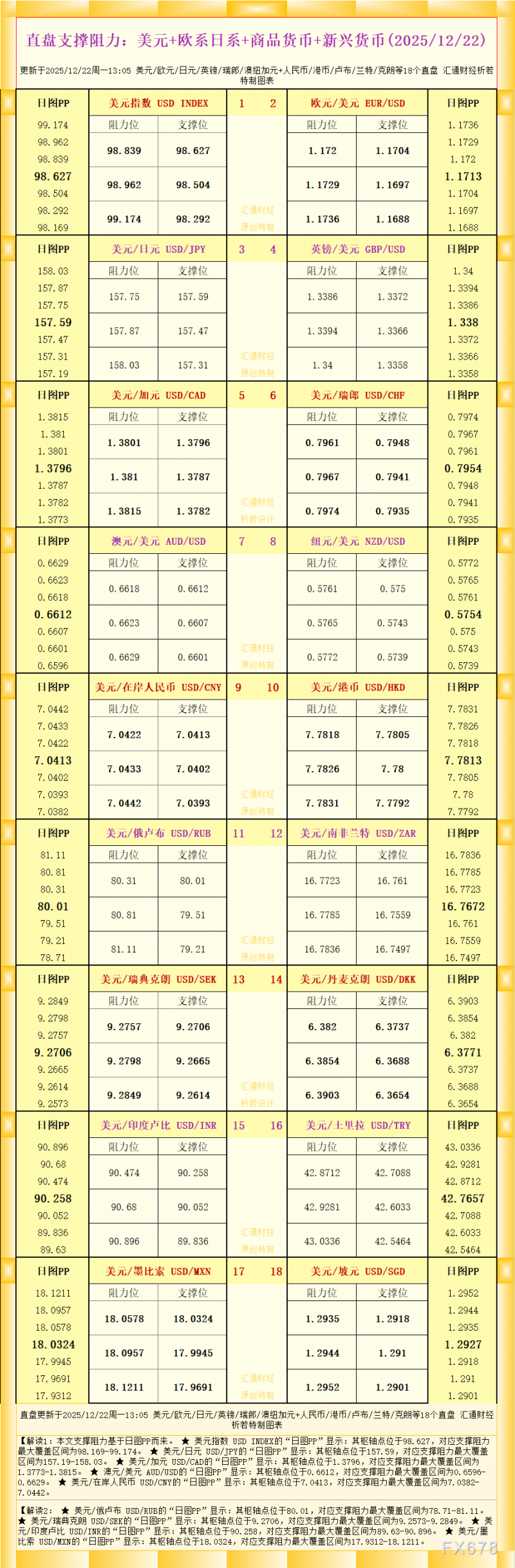 一张图看18个直盘外汇支撑阻力:美元+欧系日系+商品货币+新兴货币(2025年12月22日)