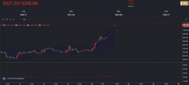从1小时级别来看,价格在前期震荡区间完成充分整理后,于昨晚至今走出明显的加速拉升结构,当前报价已站上1000整数关口,并刷新阶段新高。