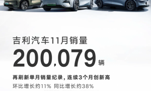 12月1日,吉利汽车控股有限公司(0175.HK)公布最新销量数据:11月乘用车销量200079辆,同比增长约38%,环比增长约11%,单月销量突破20万大关,连续3个月创历史新高、并已连续10个月保持同比、环比双增长。