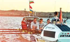 刘勇(左二)和队友在“玫瑰号”小船上。