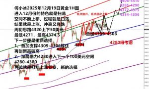 时间流转回到周一所说的4320上下50美元区间扫荡,下方4270,上方4370