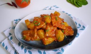 用料:猪瘦肉(里脊)450克、土豆1个、蒜头3瓣、番茄酱4汤匙、蚝油1汤匙、盐1茶匙、淀粉适量、花生油适量