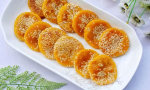 用料:南瓜200g、糯米粉100g、奶粉2勺、白糖20g、白芝麻适量 奶香南瓜芝麻饼的做法步骤