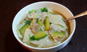 用料:面粉200克、水适量、猪肉100克、香菜一棵、盐5克、鸡精2克面片汤的做法步骤