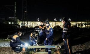 当最后一列复兴号列车在暮色中驶离包头站后,付婷炜和工友们踏着轨枕准备开始作业。她们在铁轨上推行着零级轨检仪,依靠头灯的光进行作业,光偶尔照在蓝黄色工服和橙色防护服的一角。当她们的目光凝聚在仪器上等待数据时,光才能把这六个姑娘的脸照亮。