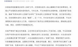 IT之家 12 月 18 日消息,“抖音黑板报”公众号今天下午发布公告称,近一个月,针对涉未成年人的违规场景,平台共清理相关违规内容 20.2 万条,对超 8000 个账号处以清理违规增长粉丝、限制商业变现功能、禁言、封禁等不同梯度的处罚。