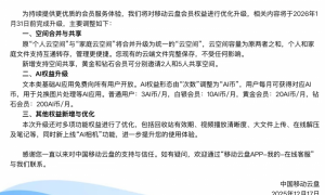IT之家 12 月 17 日消息,中国移动云盘(IT之家注:原称“和彩云网盘”)今日发布《关于移动云盘会员权益优化升级的公告》,宣布将合并现有的“个人云空间”与“家庭云空间”,同时免费开放向所有用户开放文本类基础 AI 应用。