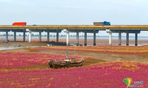 2025年5月15日,山东青岛,西海岸新区红石崖街道五河口红海滩湿地,连绵的红色碱蓬草郁郁葱葱,在咸淡水的交融滋养下恣意生长,将滩涂点染成红色海洋。当日,在潮汐往复间,火红碱蓬草与波光水色和旧船交相辉映,宛若大自然挥洒的油彩画卷。